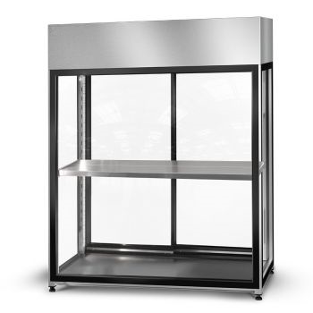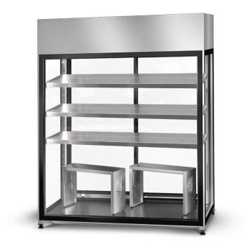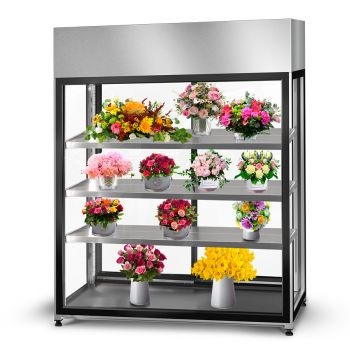 Modifiering av höljet ger dig ännu fler visningsalternativ. Du kan fritt justera nivåerna på de justerbara hyllorna för att skapa det optimala arrangemanget för dina blomkompositioner. Tack vare det panoramaliknande, härdade glaset får du perfekt utsikt från alla håll. Du ger blommorna det utrymme de behöver, eftersom du kan placera dem i behållare, hänga färdiga kompositioner på tvärstången eller visa upp dem på justerbara hängande hyllor.