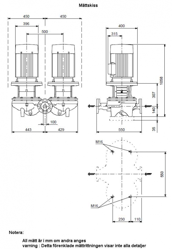 • Röranslutningen sker med PN 16 DIN-flänsar (EN 1092-2 och ISO 7005-2).