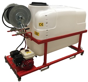 Mobil högtrycksspruta lättarbetad utrustad med ett sammanbygt pumpaket med variabelt tryckval upp till 170bar, en tank i stryktålig plast på 300liter, vridbar slangvinda med som standard 100meter 5/16 slang.