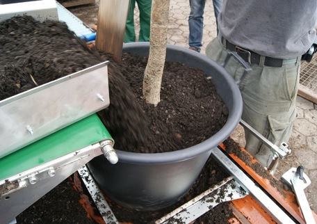 Maskinen är lätt att justera för olika pottstorlekar, tar bort det tunga arbetet, inställbar torvmatning. Krukan placeras på bandet därefter placeras den på fyllningsenheten samtidigt som krukan roterar, man kan då enkelt sätta ner rotutvecklade buskar rosor träd. När plantan placerats i krukan och fylls med torv roterande förlyttas den vidare för nästa arbetsmoment. Trycks till och staplas på vagn eller pall.