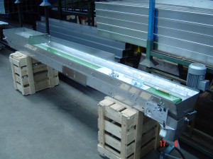 TRG150 tranportbana i sammanhållande längd försedd med sidor och överbyggnad. Banan har en bandbredd på 150mm där täcklister tar up 25mm resp sida. Bandet är en lättglidande armerat pvc band med ingjutet spår som säkerställer att bandet inte kan tvingas i sidled.